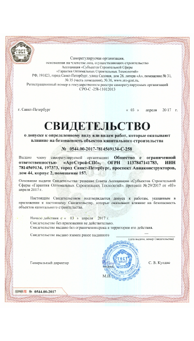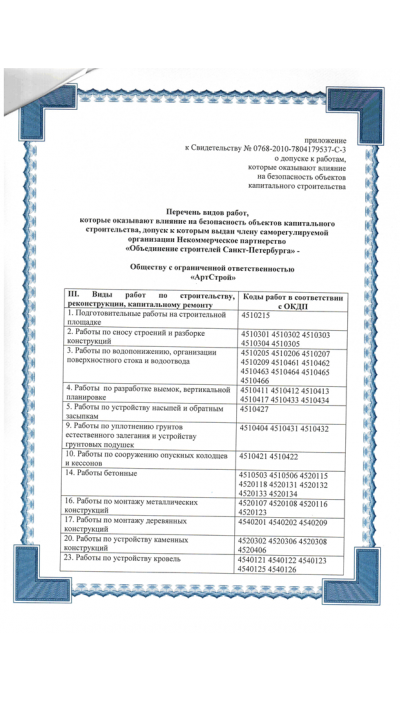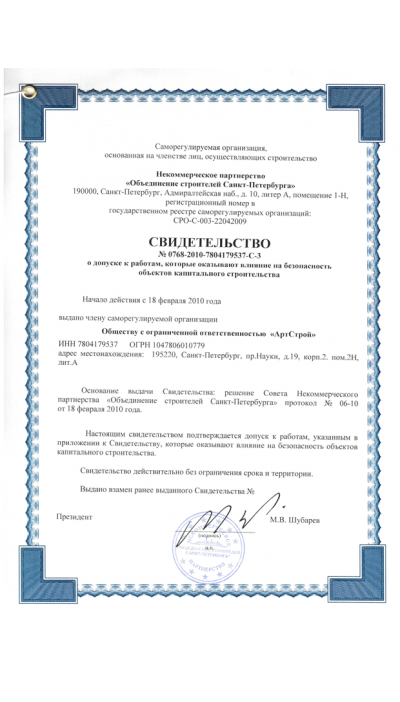 Максимальный комфорт Заказчика по срокам, качеству и планировании выполнения работ – главная цель Нашей компании. Стоимость наших работ и услуг не находятся в жестких рамках, Мы ценим и дорожим долгосрочным сотрудничеством с нашими клиентами. Накопленный опыт обеспечивает независимую деятельность компании «АртСтрой» на всех этапах производства работ, начиная с согласования проектов, заканчивая вводом в эксплуатацию строительного объекта. Глубокий анализ и понимание всех технологических и бизнес-процессов позволяет оперативно реагировать на экономические изменения на строительном рынке.